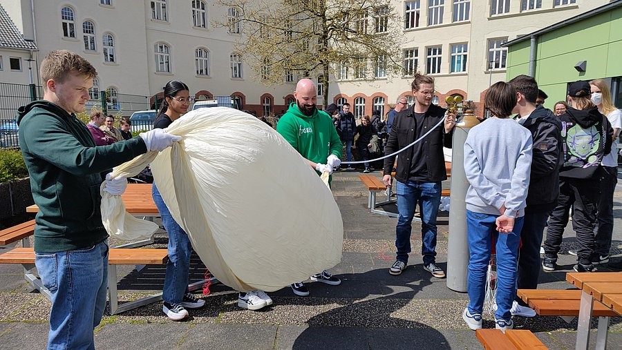 Klimadaten sammeln: Im Rahmen des Projekts „Dem Stadtklima auf der Spur“ ließen die Schüler*innen gemeinsam mit dem GeoIT-Schülerlabor der Bergischen Uni einen Wetterballon in die Stratosphäre aufsteigen. // Fotos (5) Katrin Spinnrath