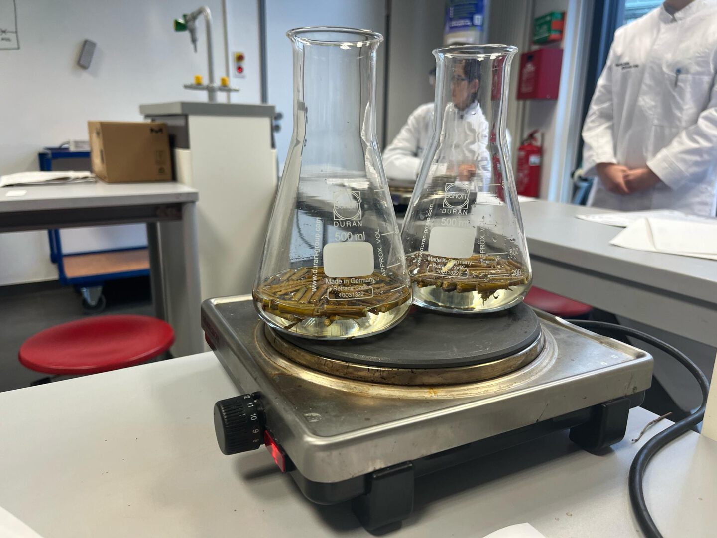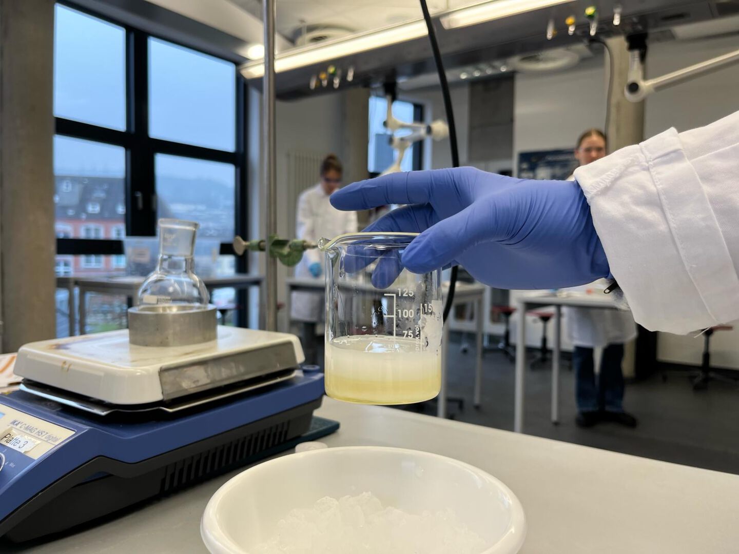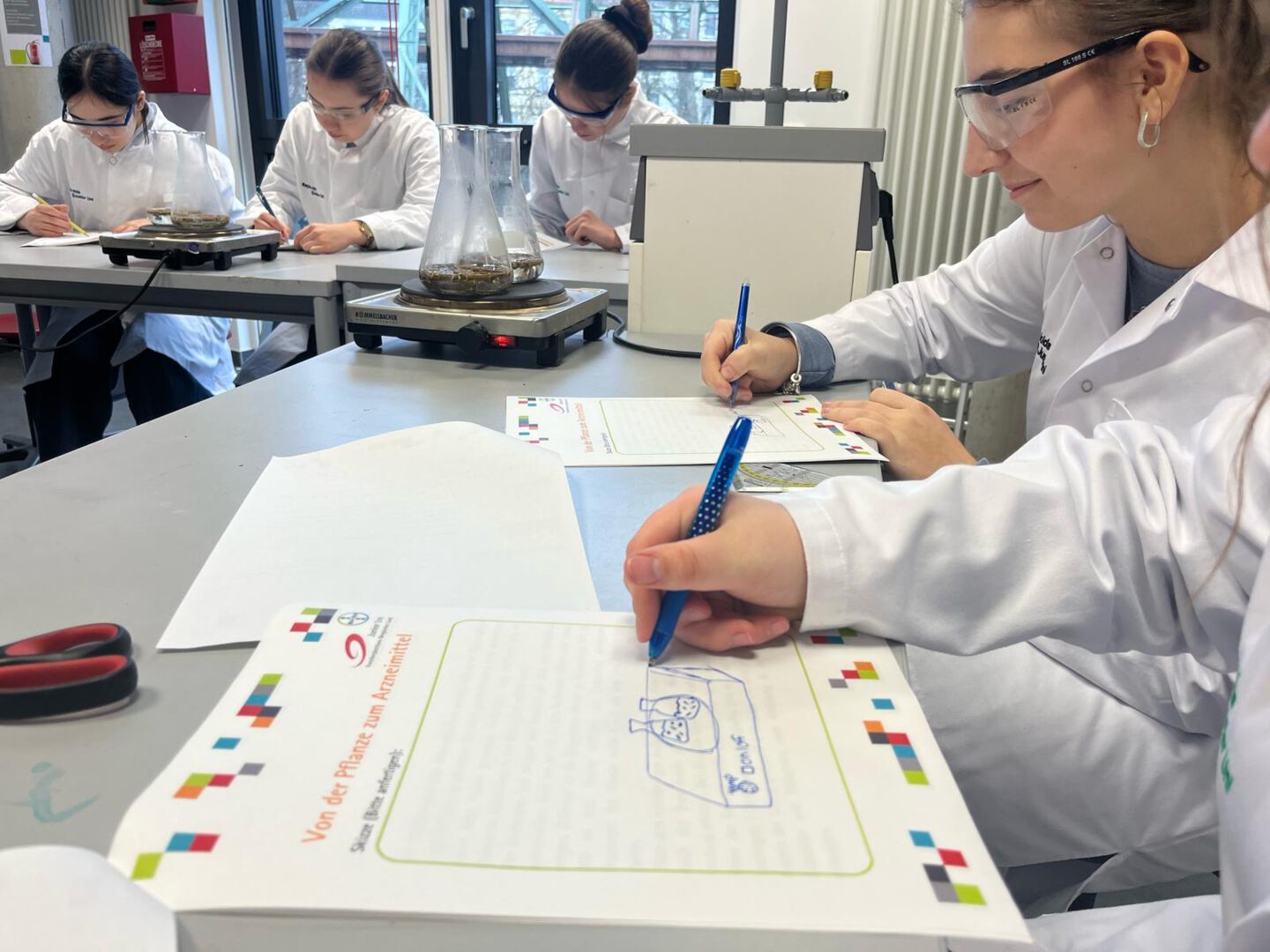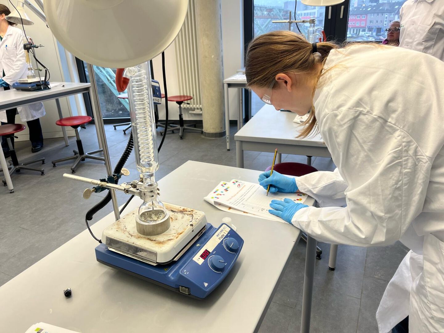 Am 13. Februar 2025 unternahm eine Auswahl von Schüler:innen der 10. Klassen des Gymnasiums Sedanstraße eine Exkursion zur Junior Uni, bei der sie selbst Acetylsalicylsäure (Aspirin) herstellten. Sie lernten zwei verschiedene Herstellungsverfahren kennen: eines auf pflanzlicher Basis und das andere auf chemischer Basis. Dabei hatten sie die Möglichkeit, mit Stoffen wie Salicylsäure, Essigsäureanhydrid und Schwefelsäure zu experimentieren. Außerdem erhielten die Schüler:innen Einblicke in die Funktionsweise von Geräten wie Rückflusskühlern, Vakuumpumpen und Hebebühnen und lernten Analyseverfahren wie die Chromatographie kennen. Die Schüler:innen wurden in zwei Gruppen aufgeteilt: Eine Gruppe beschäftigte sich mit der chemischen Herstellung, während die andere die pflanzliche Herstellung unter Verwendung von Weidenrinde untersuchte. Nach einer kurzen Pause fand ein Gruppenwechsel statt, sodass alle Schüler:innen jedes Experiment ausprobieren konnten. Der Tag war für alle Beteiligten eine bereichernde und lehrreiche Erfahrung. Ein besonderer Dank gilt den netten Studenten für die großartige Betreuung!