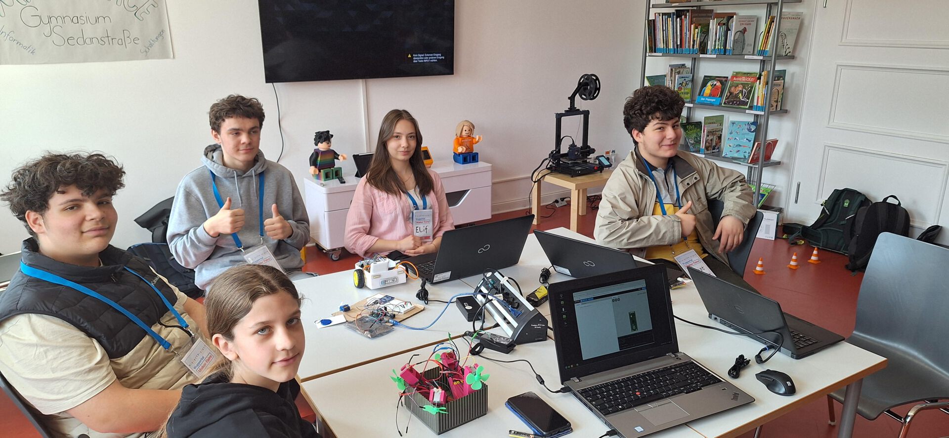 Fünf Schülerinnen und Schüler des Informatikkurses der 9. Klasse haben am Freitag die Makerfaire in der Stadtbibliothek Wuppertal besucht und dort ihre Unterrichtsprojekte präsentiert. Die Veranstaltung, die im Rahmen des Digitaltags 2024 stattfand, bot ihnen eine großartige Gelegenheit, ihre Arbeiten einem breiten Publikum vorzustellen.