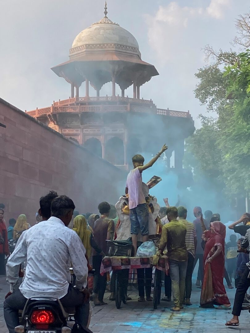 Als wir vor den Tempeln waren kamen uns Menschen entgegen die ein Fest für den Gott Ganesha feierten. Sie warfen mit Farben und hörten laut Musik.