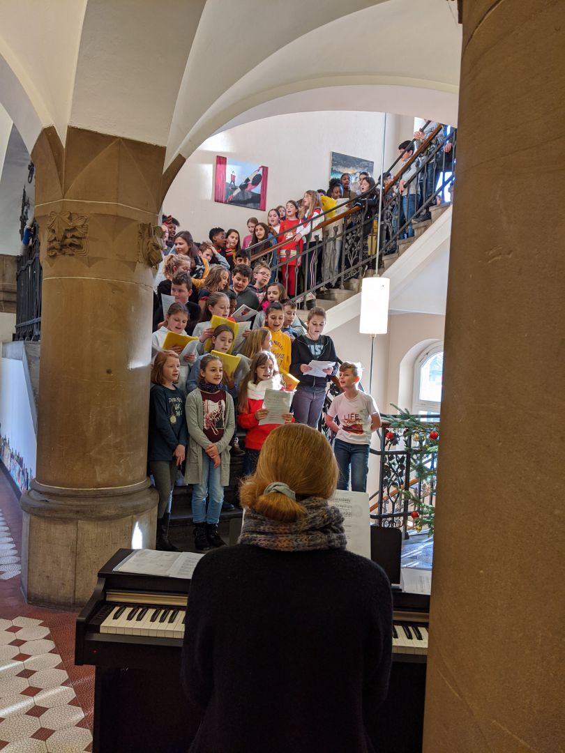 Schülerinnen und Schüler unserer 5. und 6. Jahrgangsstufen fanden sich heute Vormittag im Treppenhaus ein um gemeinsam mit den Musiklehrerinnen Frau Dietrich und Frau Sakowski einige Weihnachtslieder zu singen. Darunter …